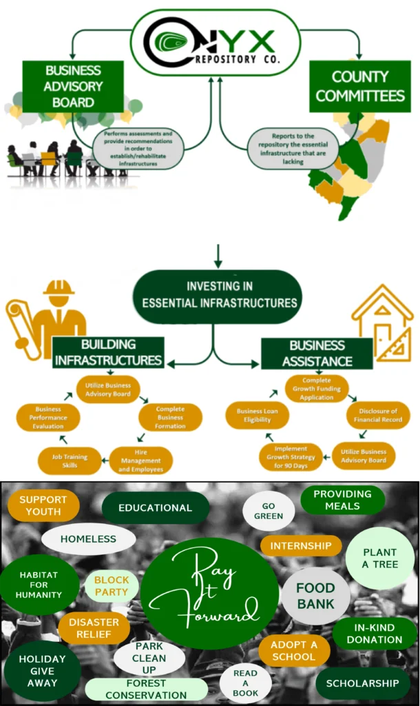 Onyx Repository Foundation is an empowerment and enabling vehicle for black people and the communities in which we live and serve. Our goal is to establish sustainable community infrastructures that advances the socioeconomic well-being of our communities and businesses. Our goal is to strengthen and rehabilitate existing black businesses and launch new startups by capitalizing on the power of group economics. Through these collective efforts, we aim to build an independent but collaborative ecosystem of short and long-term wealth building capabilities that will be the catalyst for the advancement of the black communities and businesses.